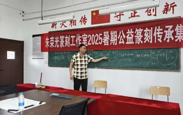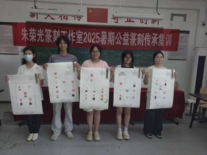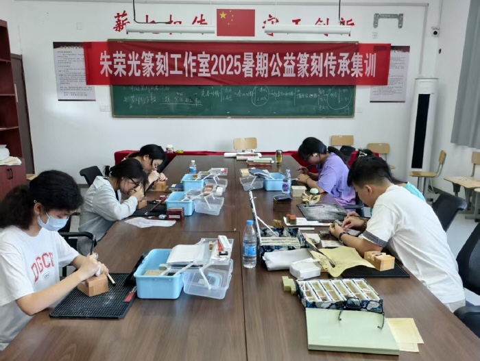 为助力2025江苏省师生主题书法篆刻展,培育青少年对传统篆刻艺术的认知与热爱,8月18日至8月23日,朱荣光篆刻工作室开展为期一周的暑期公益篆刻传承集训,通过系统化教学与实践,让学员在“刀石对话”中感受中国篆刻艺术的博大精深,为非遗文化传承注入青春力量。