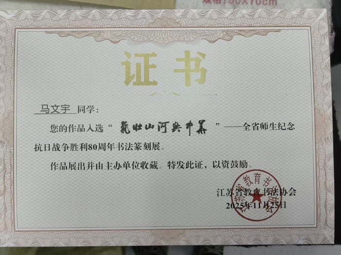 11月24日,江苏省教育书法协会主办的“气壮山河兴中华”全省师生书法篆刻作品征集评选结果公布,淮安文化艺术学校朱荣光书法篆刻工作室培养选送的钱羽欣、李星静等7名学生篆刻作品从1000多件作品中脱颖而出,全部入展,展现了学校在书法篆刻艺术教育领域的扎实成果。